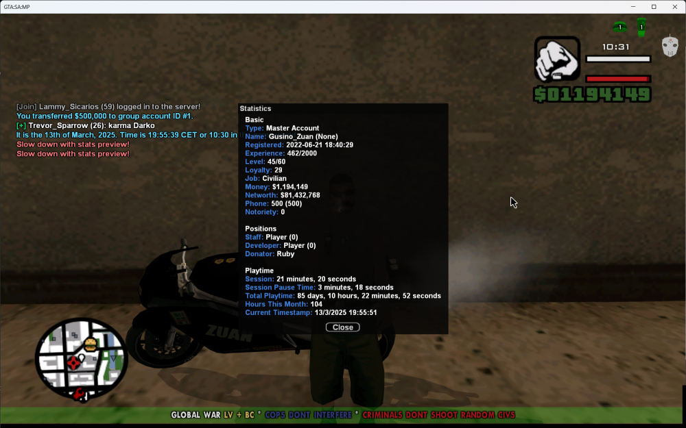 Name of the in-game character you want to participate with: Gusino_Zuan Show a photo of /stats with the said character: Attached Show a photo with /td in chat when you send payment to the government bank account: Attached Which properties are you participating for: Both LS & LV