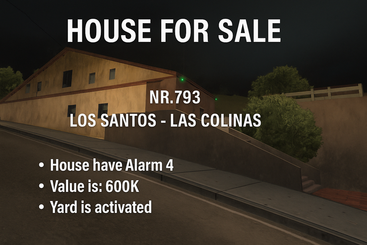 HOUSE FOR SALE – NR. 793 Los Santos - Las Colinas Equipped with Alarm Level 4 Value: 600,000$ Yard Activated